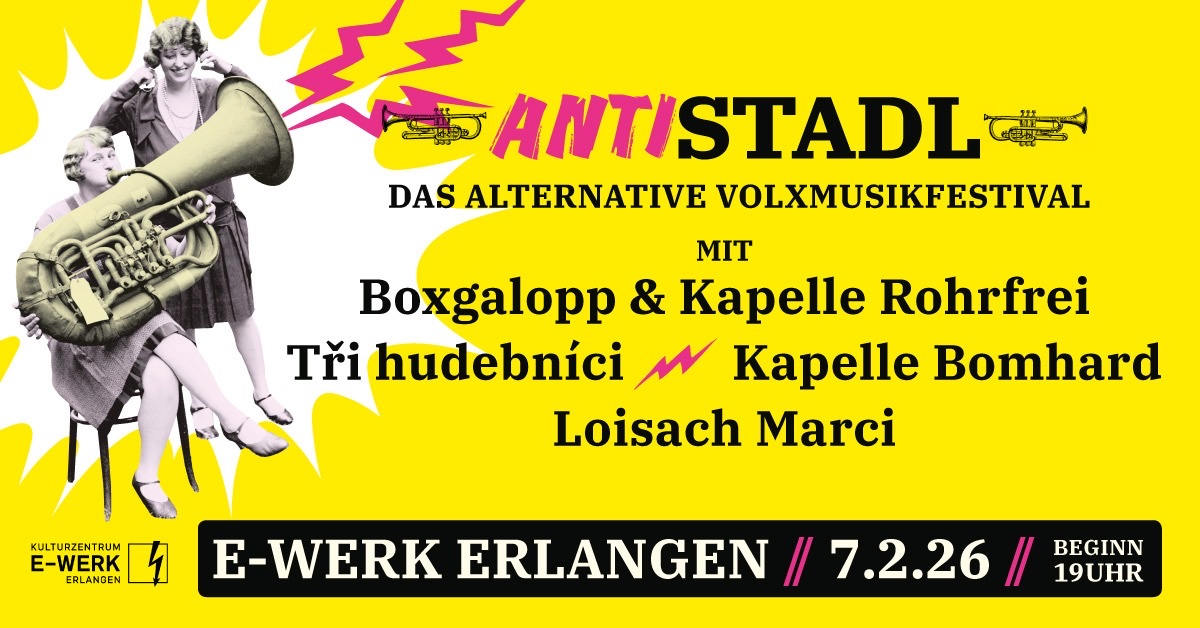 Mit Alphorn-Techno, fränkischem Highspeedfolk und grenzüberschreitender Rootsmusic aus der Oberpfalz beweist das einzigartige Antistadl-Festival in Erlangen wieder „Volxmusik ist Rock’n’Roll!“ Die traditionelle Musik früherer Zeiten musste schließlich richtig geil grooven, sonst hätte ja keiner drauf tanzen mögen. Die diesjährigen Antistadl-Acts bringen die Hits vom Dancefloor unserer Urgroßeltern mit fetten Rythmen und modernen Sounds ins Hier und Heute. Wer kommt, darf sich freuen auf: Fröhliches Springen zu wundervoll wilden Wumms. Oder Lauschen, Genießen und Staunen. Und natürlich hemmungsloses Mitschmettern bei legendären Liedern mit gewaltigem Ohrwurmpotenzial.